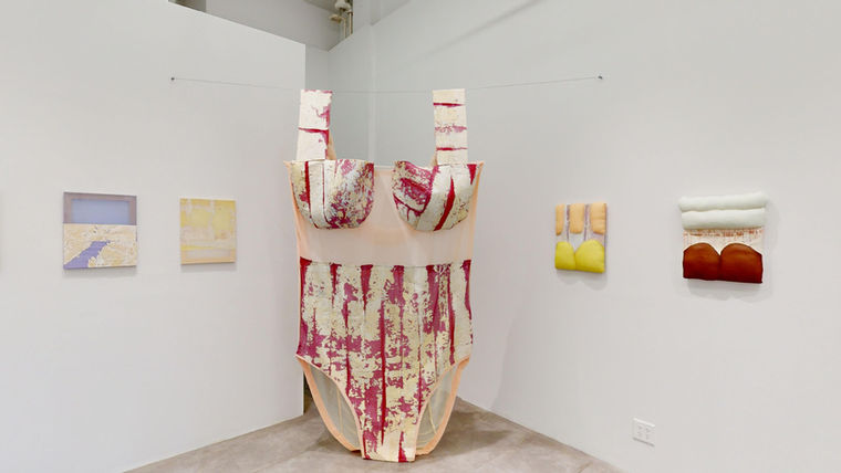 Using the transferred wall paint strips to construct oversized swimsuits, Kuchar’s centerpiece features her Space Suit (2024). Not her first foray into this series, the focal point consists of a paint-ladden wine-red synthetic organza fabric with pink and sink pieces and a braided cord detail sewn together. The swimsuit exemplifies the blurring of the boundaries between public and private spaces. The piece is hung so that the bottom of the suit touches the gallery floor, grounding it as a sculpture and transcending its appearance as a mere garment. This deliberate choice lends the works a sense of solidity and permanence, challenging viewers to reconsider their perceptions of clothing and space.